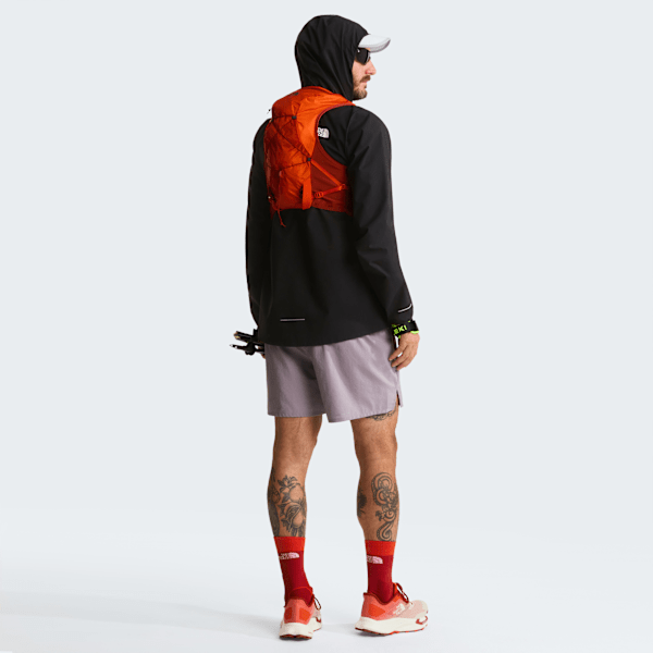 Die Sunriser 8 Laufweste ist ein Teil Weste, ein Teil Rucksack. Der 8-Liter-Rucksack bietet Platz für alles, was du für einen langen Tag auf dem Trail brauchst, während das Bungee-System zusätzliche Snacks, einen Wasserfilter oder eine Wärmejacke aufnehmen kann. Insgesamt gibt es fünf Taschen, darunter zwei Snack-Taschen, zwei Taschen für Wasserflaschen und eine Handytasche mit Sicherheits-RV. Auf der Rückseite des Rucksacks gibt‘s ein Teleskopstock-Tragesystem. Seitliche Kompression sorgt für individuelle Anpassung an deinen Oberkörper und minimiert das Aufschaukeln beim Laufen. Mit zwei weichen 500-ml-Flaschen und einem 2-Liter-Fach für die Trinkblase mit interner Schlauchführung kommt auch die Flüssigkeitsversorgung nicht zu kurz.