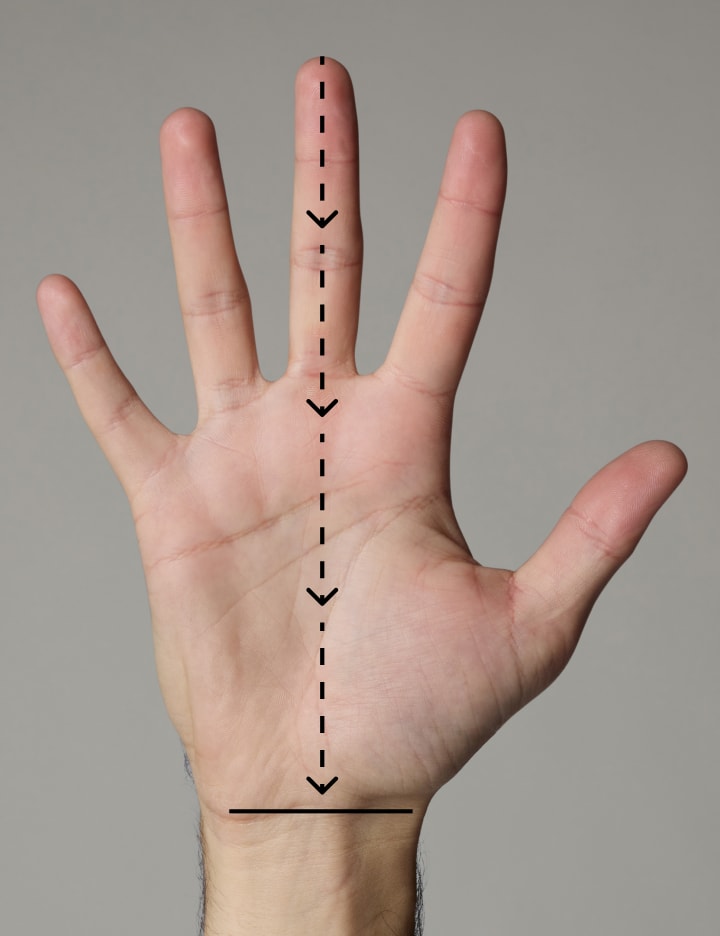 Misura la tua mano dalla punta del dito medio alla base del palmo con un metro a nastro